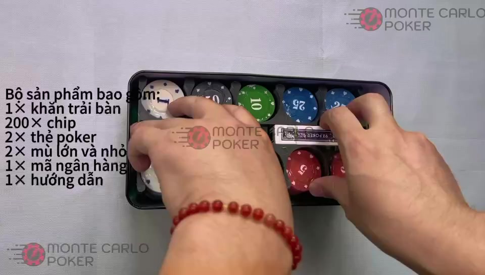 – Số lượng 100 chiếc Chip. Bao gồm: 20 chip mỗi mệnh giá: 1 – 5 – 10 – 25 – 50